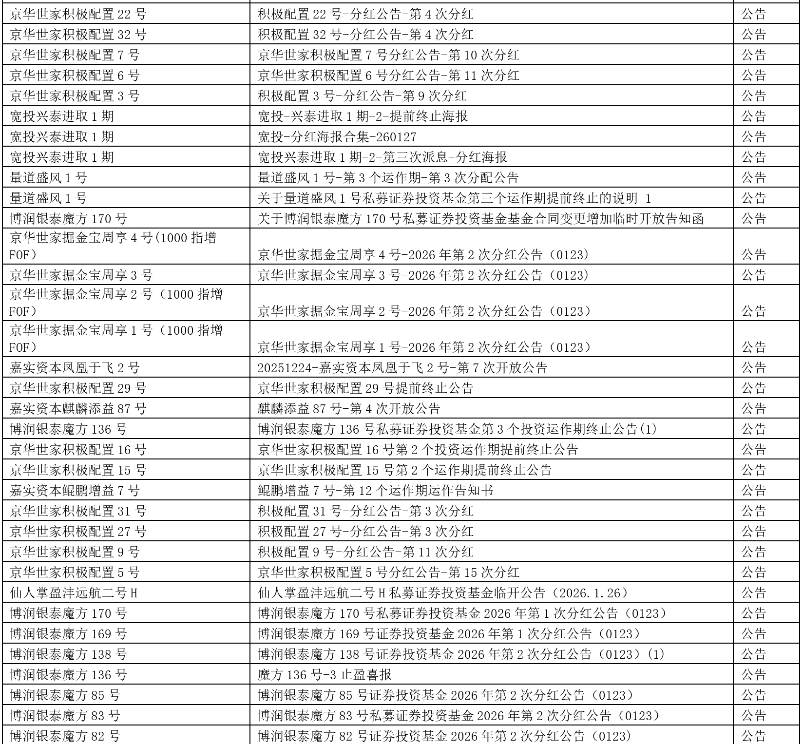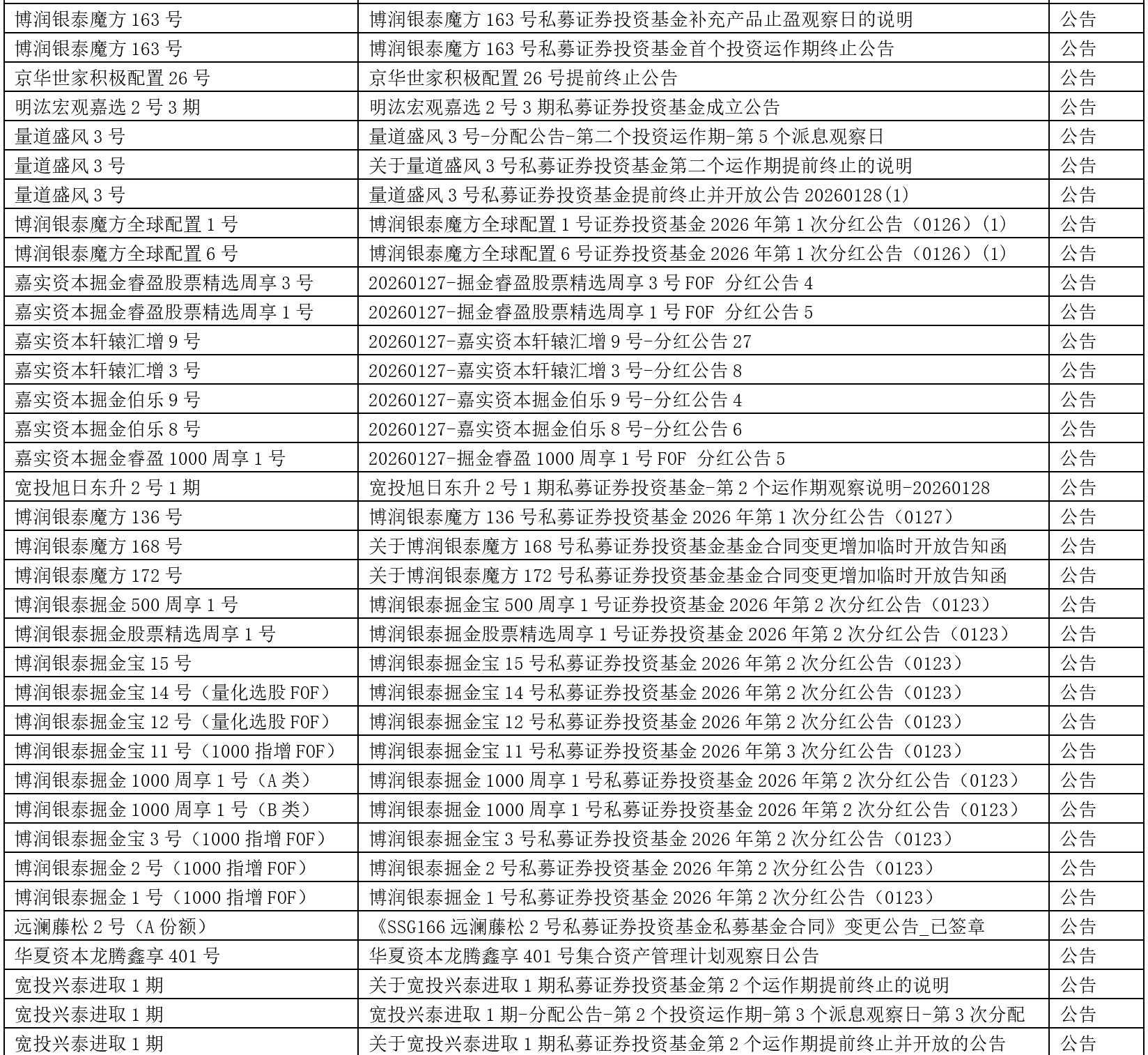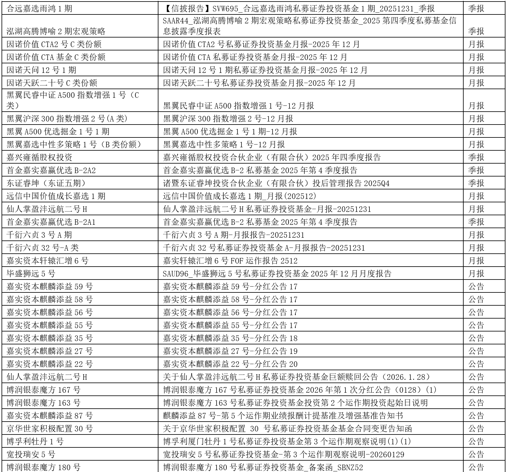 关于我们 >> 网站公告 >> 信息披露提醒2026.1.30 信息披露提醒2026.1.30 2026-01-30 尊敬的投资人: 以下产品信息已发布,请您登录会员中心或嘉实财富APP查看,或咨询您的理财师。