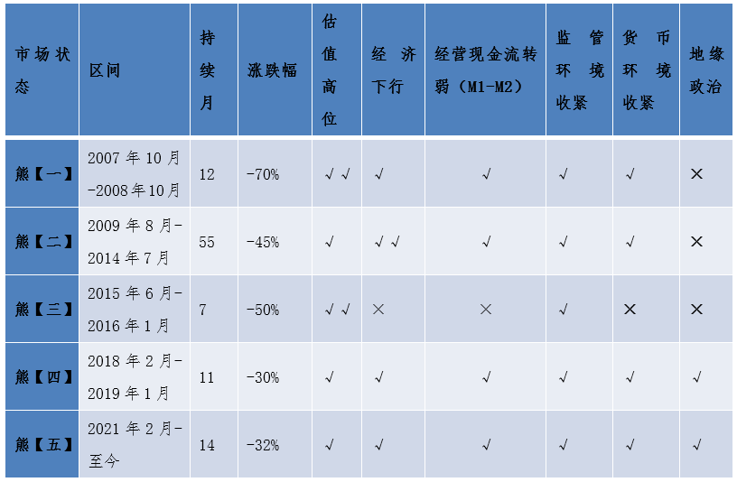 如表2所示,过去5轮熊市中,每一轮熊市初期估值基本都处于阶段高位,都面临监管环境收紧的挑战。其中四轮伴随着经济下行、企业现金流转弱以及货币政策收紧。2015年6月牛市泡沫破裂后,虽然面临的是宽松货币政策环境,但估值泡沫过大,超过了政策宽松带来的支撑。