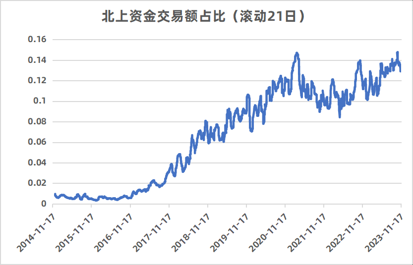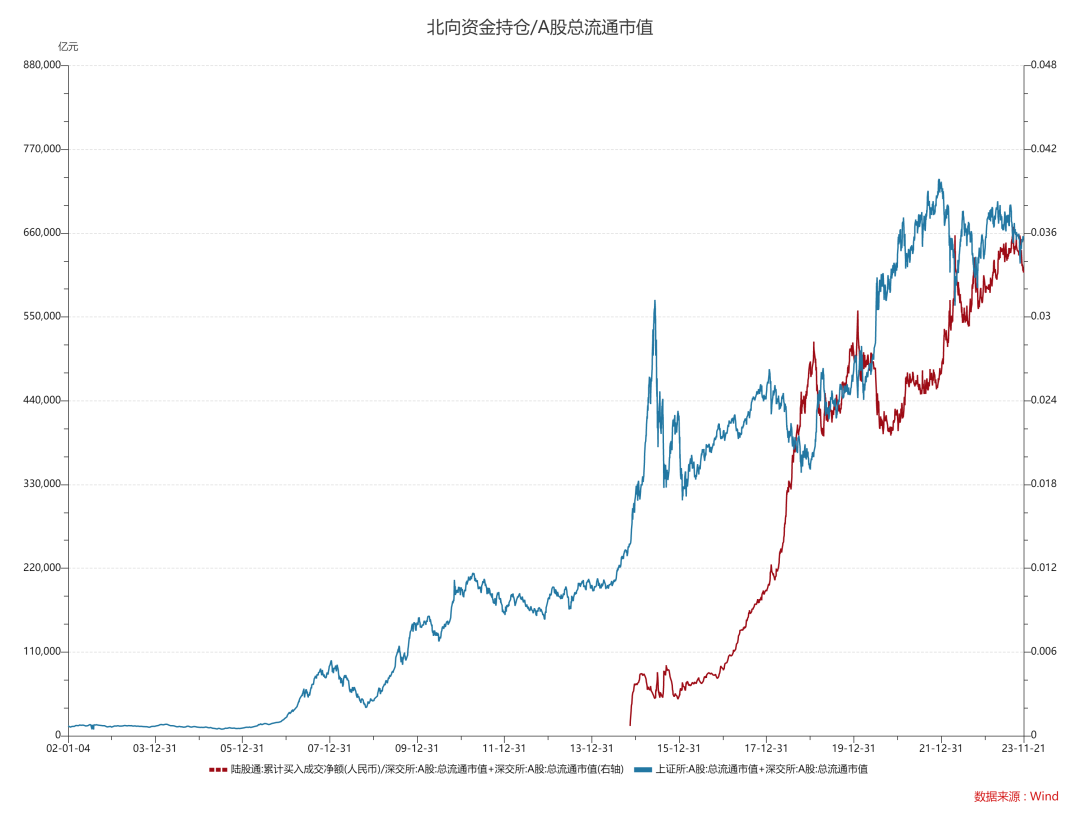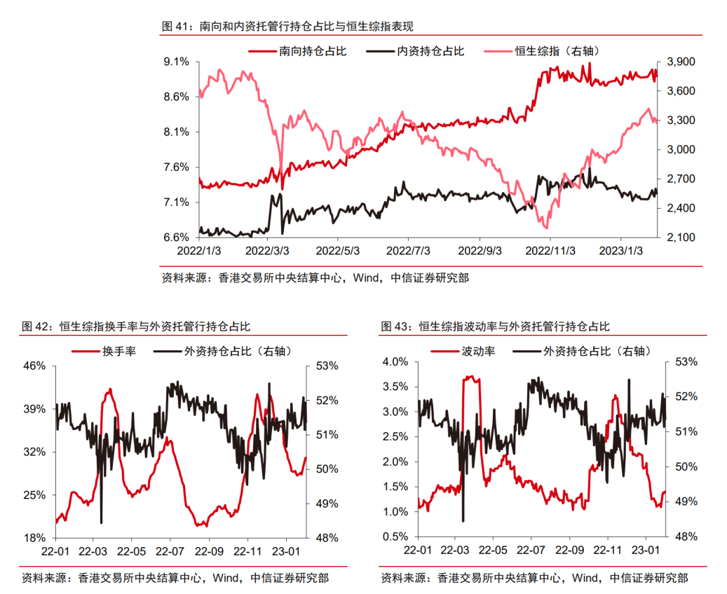 与此同时,外资在两个市场的力量也不同。从外资对A股交易额的贡献平均来看,外资交易额贡献了大约13%的A股交易额。从持仓角度来看,外资占A股流通市值的比重大约3.6%。在港股市场,外资的力量更大。目前港股市场外资持仓占比仍然接近50%。自2021年互联网教培行业政策以来,外资的撤出是持续的,但对港股市场的冲击更大。这也间接可能拉大A+H股溢价率。