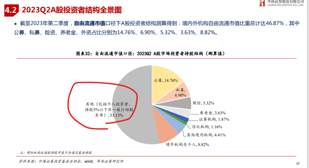 A股的投资者中,散户(个人投资者)持股占比依然接近50%(如下图)。