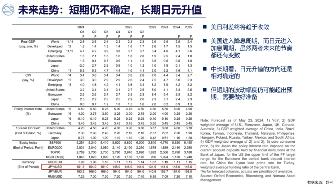 但从中长期来看,美日之间的利差终将会有所收敛。站在周期的角度,日本这一轮的周期其实跟多数国家是相反的,日本直到最近才看到了比较明确的通胀趋势,而且到现在通胀幅度也不像欧美国家之前那么大,所以在这个过程当中,它可能面临着一个相对温和的加息周期。以中长期维度的视角,日元升值的方向相对确定,我们预判日元大概率会继续升值,预计1年内将有望触及145的水平,但短期的波动幅度仍可能超出预期,建议投资者做好准备。