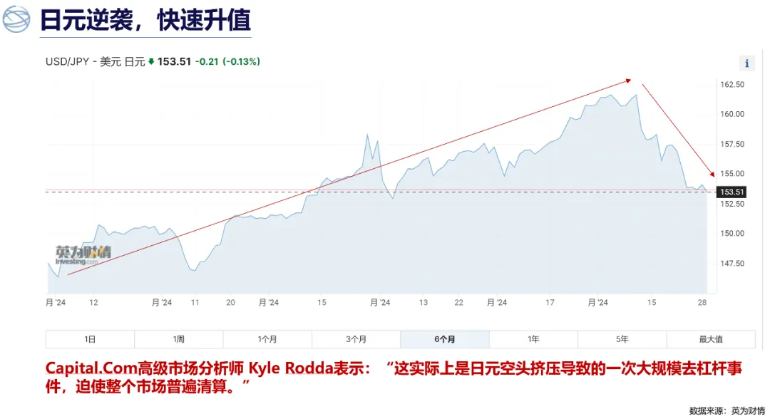 今年以来,日元经历了一个持续的贬值过程。最高的时候,美元与日元的兑换汇率一度达到了接近1:162的高位。而在最近一段时间,日元出现了一轮明显的逆袭,美元与日元的汇率从高点的162左右下降到153、154左右的水平。Capital.Com高级市场分析师 Kyle Rodda表示:“这实际上是日元空头挤压导致的一次大规模去杠杆事件,迫使整个市场普遍清算。”