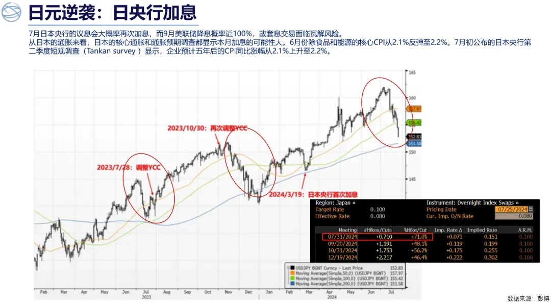 那么,为什么最近日元的套息交易似乎突然间瓦解了?或者说出现了一些逆转的迹象?过去这一年多的时间里,日元并不是第一次出现突然的升值,如下图所示,前两次的短期升值是因为日本两次调整了收益率曲线控制(YCC)政策,而此轮的升值倒不是因为调整了YCC政策,而是因为日本央行可能再次加息。日本近期的通胀数据支持日本央行的加息动作,日本6月份除食品和能源的核心CPI从2.1%反弹至2.2%。7月初公布的日本央行第二季度短观调查(Tankan survey )显示,企业预计五年后的CPI同比涨幅从2.1%上升至2.2%。7月31日,日本央行将举行新一次议息会,市场倾向于认为,日本央行的加息概率大概为七成左右。