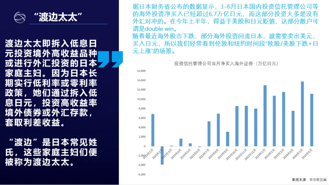 在过去几年中,套息交易是非常盛行的,大部分人认为日本会长期维持低利率按兵不动,以促使日本国内的通胀能够重新循环起来。因此,一部分投资者在这个过程中借助低息的日元去炒作其他资产。其中最为典型的案例就是人们所熟知的“渡边太太”。所谓渡边太太,即拆入低息日元投资境外高收益品种或进行外汇投资的日本家庭主妇。因为日本长期实行低利率或零利率政策,她们通过拆入低息日元,投资高收益率境外债券或外汇存款,套取利差收益。“渡边”是日本常见姓氏,这些家庭主妇们便被称为渡边太太。