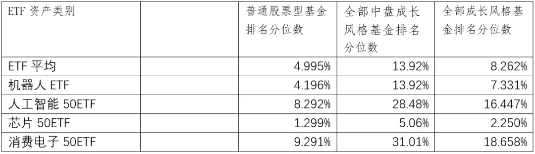 表中ETF的业绩在普通股票型基金、中盘成长风格基金以及全部成长风格基金的业绩排名分位数都在前1/3,部分还在前5%。