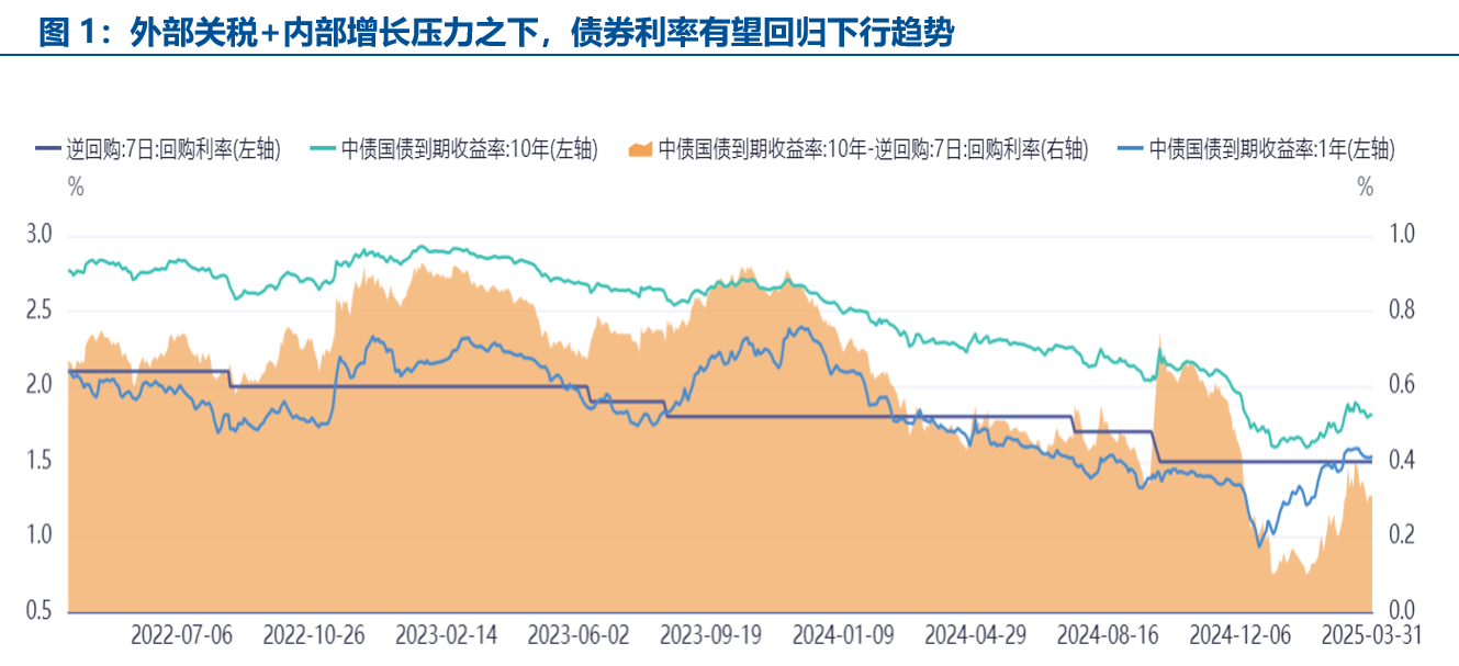 外部关税+内部增长压力之下,债券利率有望回归下行趋势。特朗普大超预期的“对等关税”将会进一步冲击全球经济的增长环境,同时,美国对华关税的“目的性”较强,转口贸易也会面临较大的冲击,叠加中国的反制措施,短期内贸易争端对外需的冲击加大,出口对GDP的贡献将明显降低。市场将更加聚焦对内提振消费、扩大内需等政策的对冲力度,货币宽松或将在短期内可以见到,财政、地产、消费支持计划等政策也有望加速落地。目前国内债券收益率经过一季度的调整之后已经具备一定的配置价值:短端的1Y国债维持在1.5%附近,10Y、30Y国债收益率回到1.8%、2%以上,10Y国债与政策利率7天OMO之间的利差回到30BP附近。在当前经济数据改善力度仍较弱、外部关税冲突进一步削弱增长动力、货币宽松即将落地的环境下,债券市场收益率有望重新回归下行趋势。