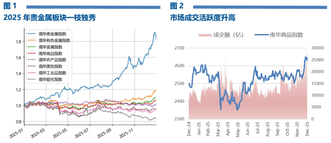 回顾过去几年的表现,国内CTA策略经历了一段起伏的历程。上一个CTA大年是2020年,随后几年虽然表现波折,但CTA策略整体仍然创造了正收益且显示出较好的回撤控制。2025年,市场整体呈现出贵金属板块一枝独秀&其余板块震荡分化的行情,商品板块间强弱关系相对而言比较稳定,长周期类因子表现相对较好。同时,期货市场不断有新品种入市,市场成交活跃度亦有上升,为CTA策略的运行提供了良好的土壤。
