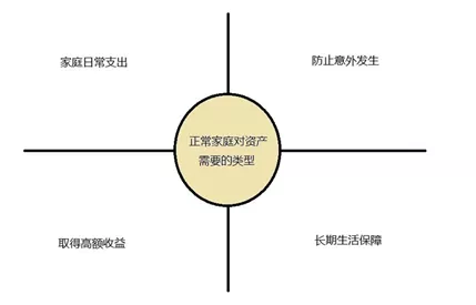 这幅象限图把家庭资产分为四种属性,分别对应四个账户:第一类是要花的钱,对应日常开销账户;第二类是保命的钱,指的主要是用于保险保障的开支;第三类是生钱的钱,对应投资收益账户;最后一类是保本的钱,也就是长期收益账户。这四类资产,在家庭总资产中的占比、风险承受能力、预期收益率、投资时间等方面的要求和属性截然不同。