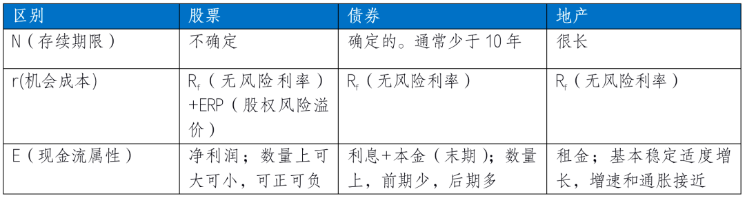 股票、债券、房地产的定价原理都可以用现金流贴现模型,区别是现金流的属性、存续期的特征、以及折现率的内涵。表1罗列了三类资产定价上的主要区别。