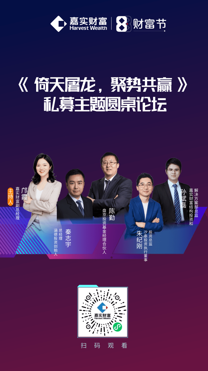 在2021年嘉实财富88财富节云峰会的私募主题圆桌论坛上,盘京投资基金经理、合伙人陈勤、涵德投资创始人、总经理秦志宇、汐泰投资执行董事、投资总监朱纪刚几位明星私募基金管理人与嘉实财富副总经理邝霞博士、嘉实财富结构投资和解决方案部总监孙斌磊展开精彩对话,分享了彼此对今年市场环境和投资机会的看法: