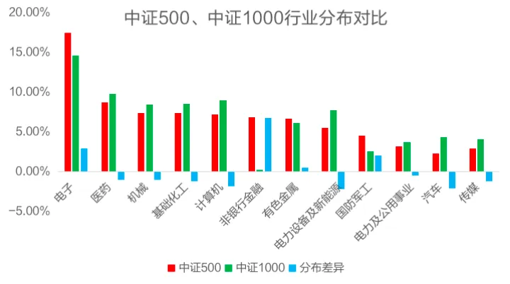 中证500、中证1000也是投资者普遍关心的两个指数。从行业分布的差异来看,中证500的电子、非银金融、国防军工的比例多于中证1000,医药、机械、汽车、基础化工、计算机、电力设备则是中证1000较为多一些。甚至简化说,中证1000的机器人主题占比多一些,中证500的人工智能主题多一些。