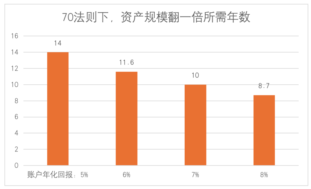 宏观经济学里面经常提到一个“70法则”。就是用70除以增速,可以得到,这个增速下的复利增长,需要多少年实现资产规模翻一倍。