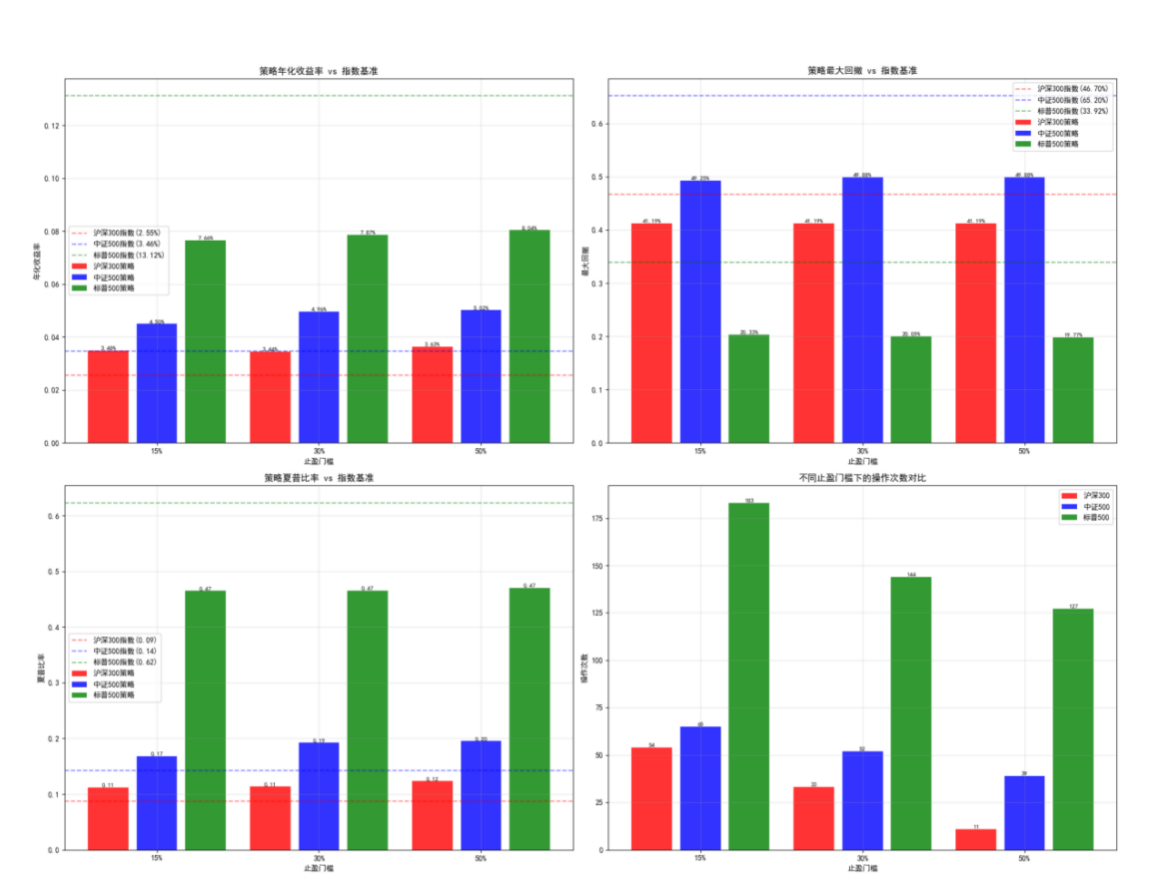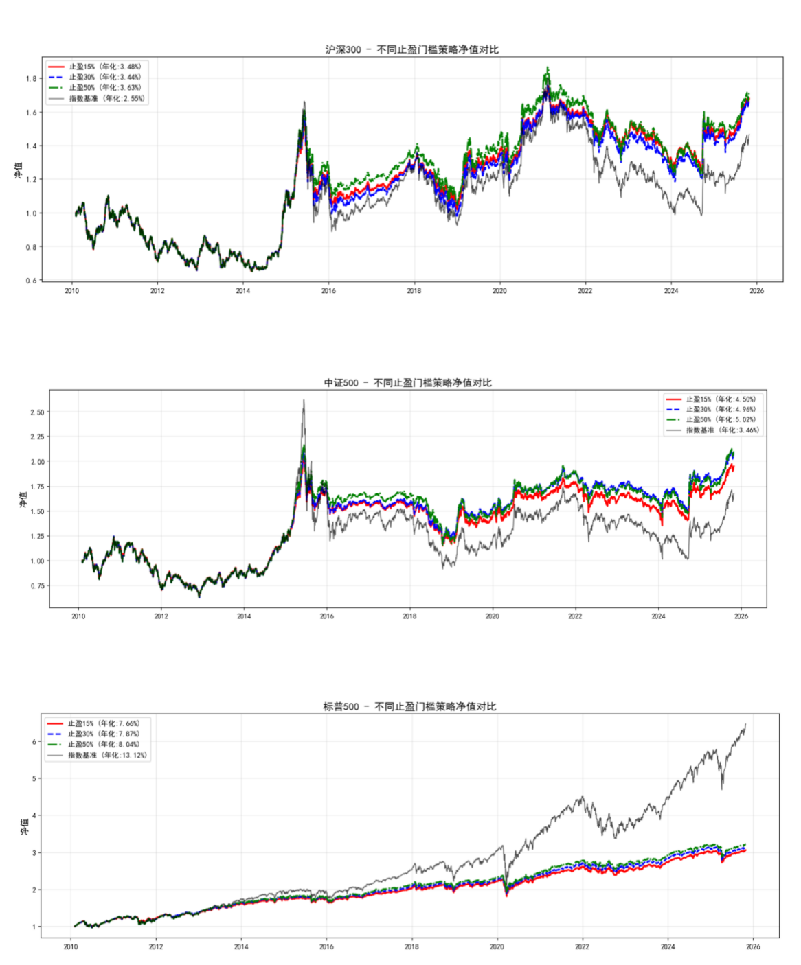 沪深300、中证500、标普500的止盈门槛为15%、30%、50%