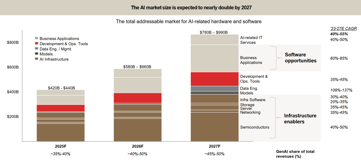 AI的全球产业趋势,其作用和地位已经毋庸置疑。甚至可以说美国经济周期≈AI周期,AI成为左右经济增长的最基石性的行业,也是美股未来是否继续体现出其成长性的根本。