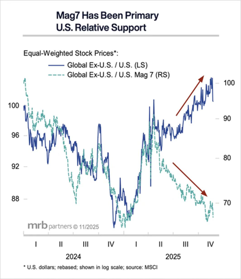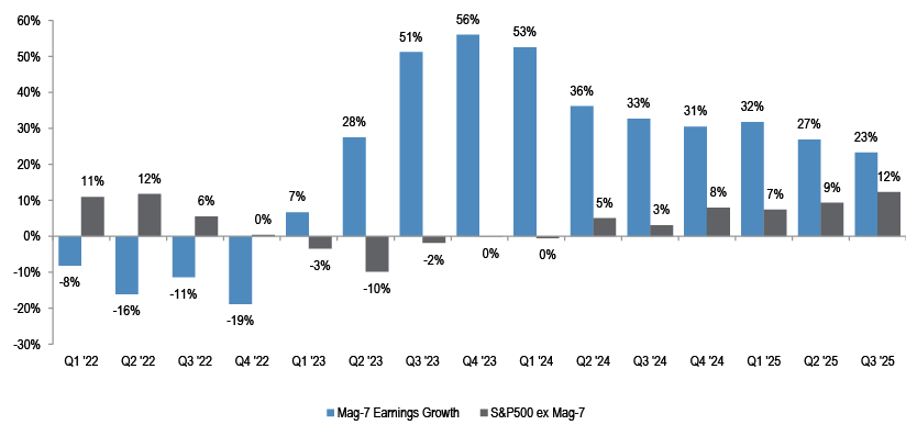 我们还观察到,美股在明年的盈利预期上,“七姐妹”同其他股票的盈利增速差距将进一步收窄,这将有利于更广泛意义上的美股牛市,而不仅仅是过去几年的科技牛市。因此,我们认为,美股2026年将是一个从科技牛到扩散牛的阶段,科技股公司的表现与其他行业板块的表现的差异性将收窄。