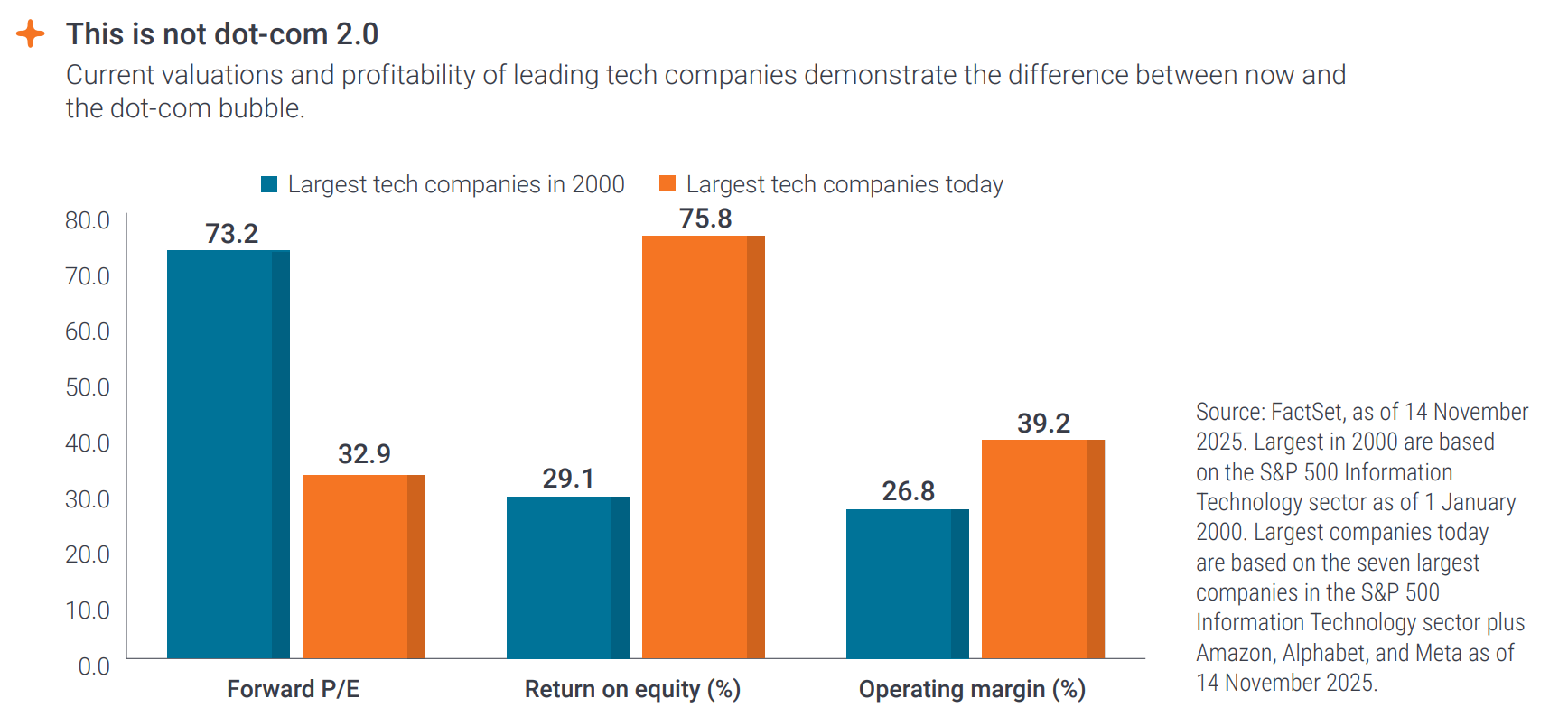 虽然对科技泡沫的担忧近期甚嚣尘上,但对比千禧年的互联网泡沫阶段,当下的美股科技股还是具有更强的基本面支撑,如下图所示,对比2000年的阶段,当下的美股科技公司在估值、ROE以及利润率等方面均优于当时,对科技泡沫的问题我们认为不必过于担忧。