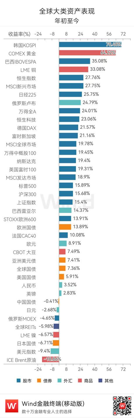 2025年的全球股市表现不俗,如下图所示,截至12月15日,全球股市普遍录得上涨,其中部分新兴市场股指尤其耀眼,韩国KOSPI指数涨幅超过70%,巴西IBOVESPA指数涨幅则超过35%,此外包括中国股市、欧洲股市等市场涨势同样喜人。