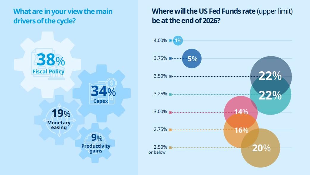 事实上,不光是美国,全球诸多国家都将更多的期待放到财政政策的发力上,我们将在2026年看到全球性的财政扩张局面。如图2所示,根据东方汇理的调研,全球投资者认为能够对经济周期形成驱动力的主要方面在于财政政策(38%),其次是资本支出(34%),再往下才是货币政策(19%)和劳动生产率提升(9%)。