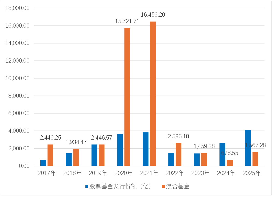 首先,存款搬家具有非线性特征。初期存款搬家的规模比较温和,积累到一定阶段后将出现量变到质变的暴增。以2018-2021年公募基金发行数据为例,2018年混合基金发行1934亿份,2019年增至2446亿份,增长20%以上。这个数据在2020年则激增至1.5万亿,接近翻8倍。2025年存款搬家特征不明显。