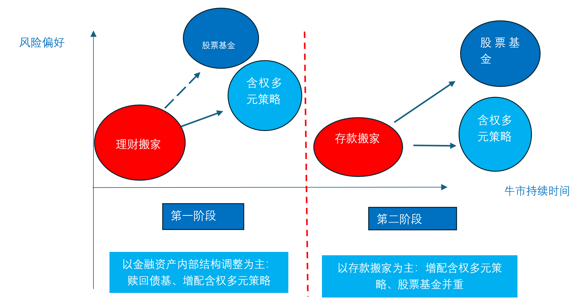 1. 第一阶段:理财搬家(对应牛市早中期)。核心特征是不动用存款,仅调整金融资产内部结构,投资者以“试一试”心态为主,存在犹豫和观望情绪。具体表现为赎回债券基金,增配固收加基金、含权类多元策略基金(比如全天候策略),2025年此类策略在财富管理市场已大放异彩。主动类基金赎回力度下降,年底出现回升迹象。