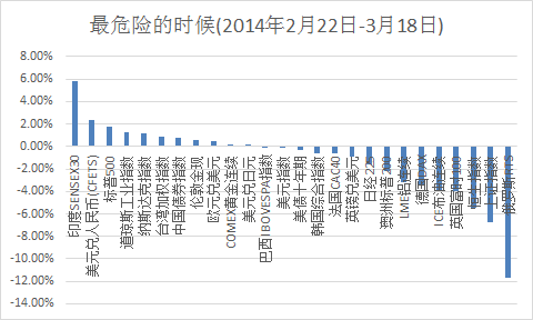 在第一次乌克兰危机最危险的时期(图3),大类资产表现为:印度、美国股市涨,亚欧洲股市跌、债市涨、黄金涨、原油跌。整个阶段持续了大概一个月左右时间。